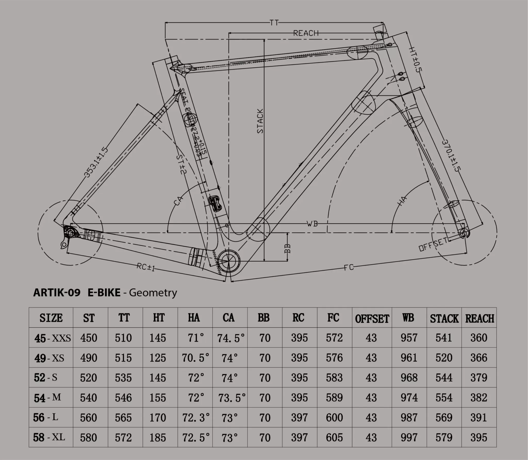 Ontworpen in de traditie van de mooiste racefietsen van het merk, heeft de ARTIK-09 een frame dat volledig van koolstofvezel is gemaakt en waarin de elektrische bedrading is geïntegreerd voor maximale discretie en een perfecte esthetiek. De lichtgewicht accu (slechts 2,3 kg) is aan de fiets bevestigd met een automatisch bevestigingssysteem, dat de vele trillingen voorkomt waar racefietsliefhebbers zo bang voor zijn. De motor van de ARTIK-09 is ontworpen om een hoog vermogen (250 watt) te leveren en een optimale gewichtsverdeling mogelijk te maken dankzij de integratie in de achternaaf, waardoor ook de vermogensverliezen als gevolg van kettingoverbrenging vermeden worden.