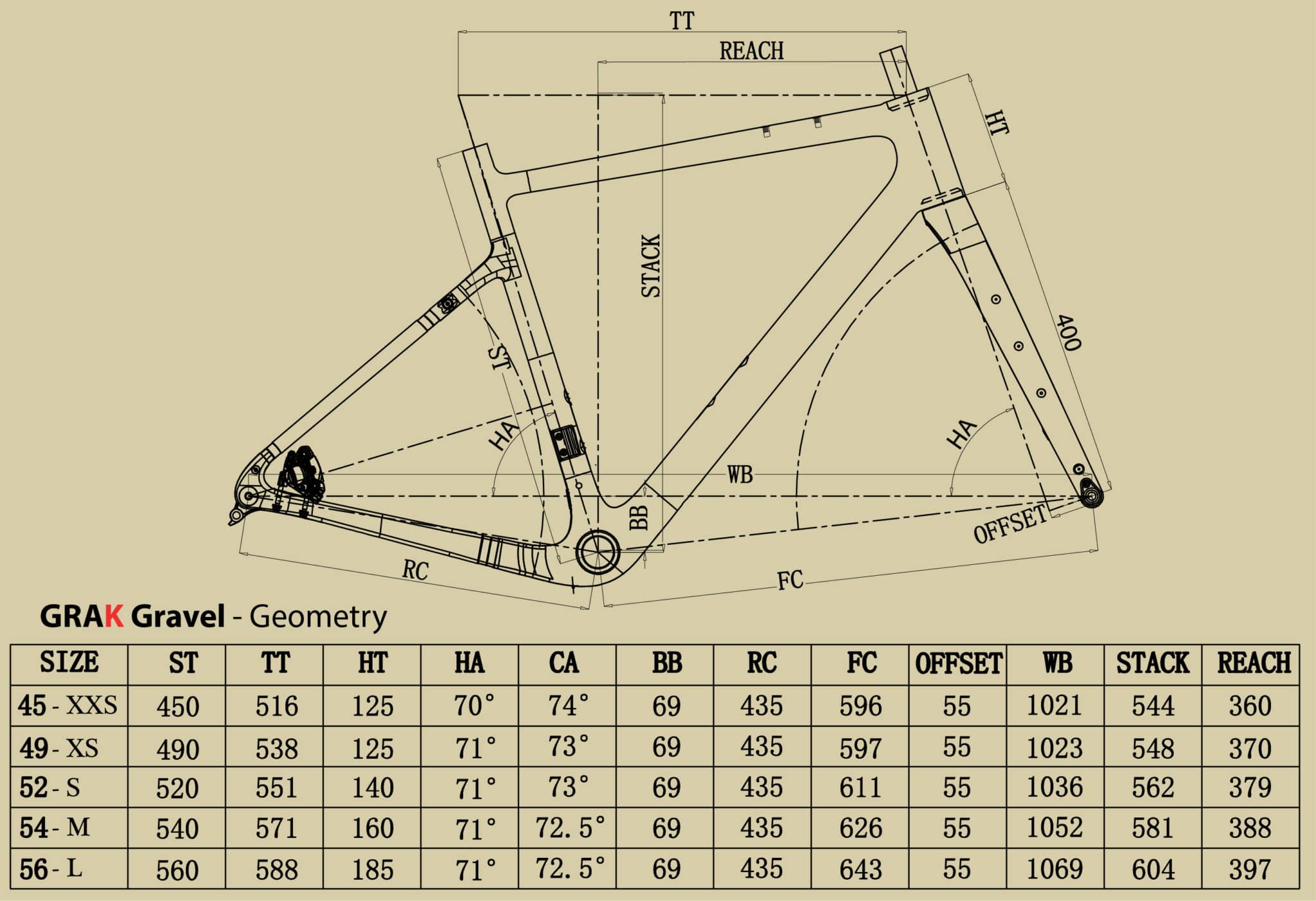 Gezien zijn kenmerken kan de GRAK worden beschouwd als een ‘offroad-endurance’-fiets, een samenvatting van de sterke punten van twee werelden. De GRAK beschikt ook over beugels voor het bevestigen van bagagerekken, waardoor fietsers en bikepackers maximale vrijheid krijgen. Het frame is een T700 UD-HM carbon monocoque, met grafeen- en Kevlar®-versterkingen op de meest belaste plaatsen en aerodynamische profielen.