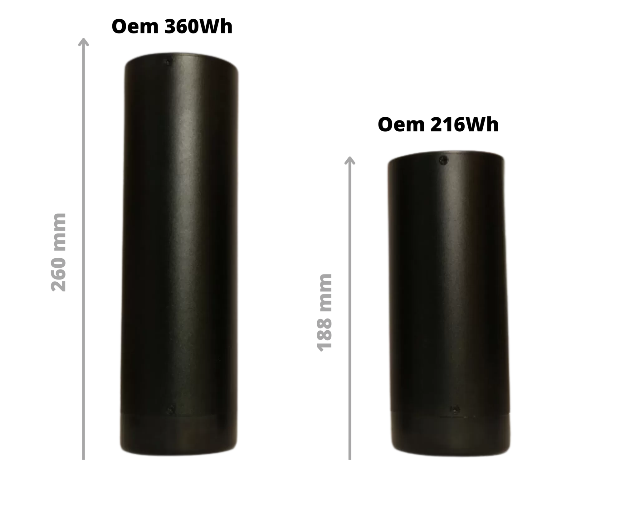 Als het OEM-bereik geschikt voor u is, maar u hebt niet zo’n groot bereik nodig, dan raden wij u aan om eens naar de OEM 216Wh-batterij te kijken. Als u op zoek bent naar een langere levensduur, een grotere autonomie of een kalebasvormig ontwerp, kijk dan niet verder dan het TESLA-assortiment batterijen.