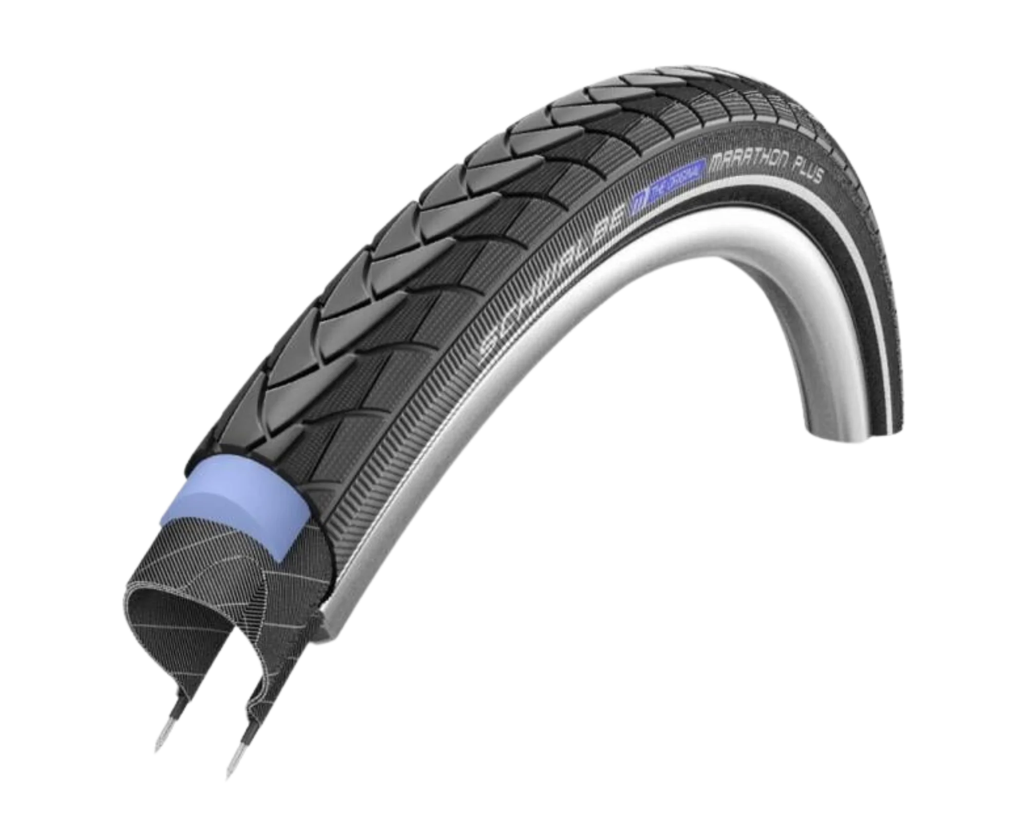 De veelzijdige en slijtvasteMarathon + band van Schwalbe heeft een lekbescherming en een versterkte zijwandbehandeling om het ontstaan van microscheurtjes te vertragen. Zeer lage rolweerstand.
